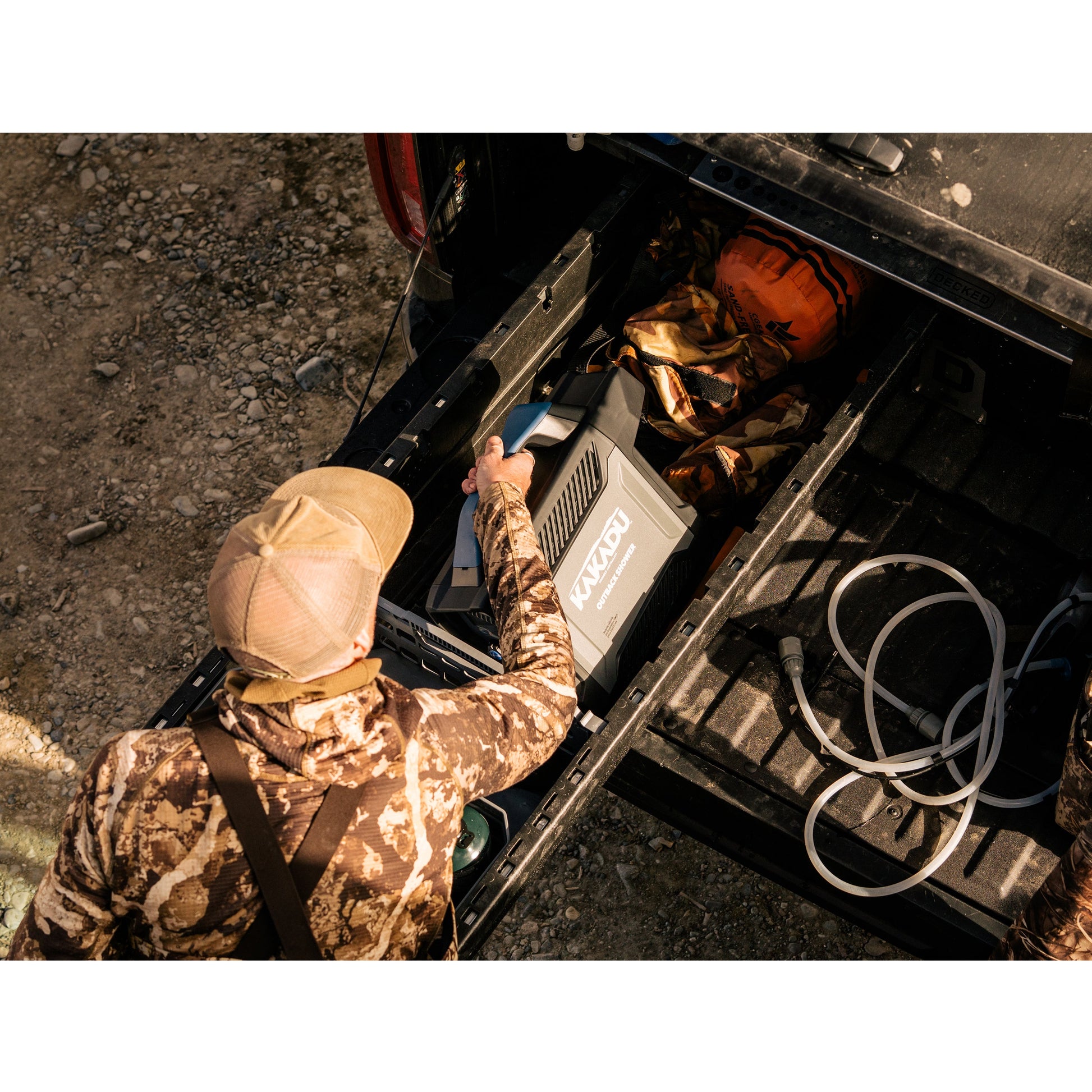 The Kakadu Outback Shower is a compact and portable shower system designed for outdoor use, providing hot water in seconds. It is lightweight and easy to use, making it an ideal companion for camping, hiking, and other outdoor adventures. With its integrated lithium battery and efficient pump, you can enjoy up to 2 hours of hot showers on a single charge. Just add a pound gas bottle and water, and you'll have hot showers anywhere, anytime. The shower unit features an automatic ignition system for easy start-up, and the shower head switch allows you to control the water flow according to your preferences. Cleaning is a breeze with a simple wipe down using a damp cloth. The Kakadu Outback Shower comes complete with all the necessary components, including the shower unit pump and hose, shower head and hose, DC charge cable, and a user manual.